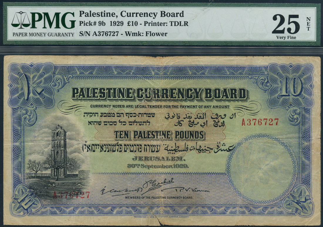 Palestine Currency Board, £10, 30 September 1929, serial number A376727, blue and green, Crusader's Tower in Ramleh at left, value in each corner and at centre, reverse, Tower of David citadel in Jerusalem
