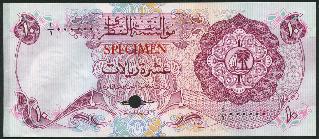 Qatar Monetary Agency, colour trial 10 riyals, ND (1973), serial number A/1 000000, maroon on multicolour underprint, coat of arms with dhow and palm trees at right, reverse, Qatar Monetary Agency headquarters building at centre left