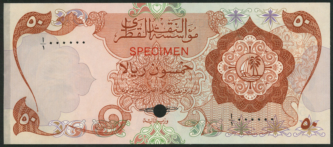 Qatar Monetary Agency, colour trial 50 riyals, ND (1973), serial number A/1 000000, brown on multicolour underprint, coat of arms with dhow and palm trees at right, reverse, off shore oil platform at centre left