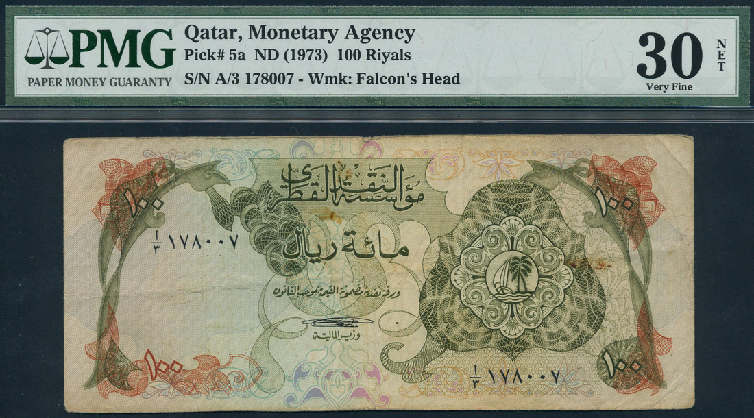 Qatar Monetary Agency, 100 riyals, ND (1973), serial number A/3 178007, olive green on multicolour underprint, coat of arms with dhow and palm trees at centre right, reverse, Ministry of Finance building