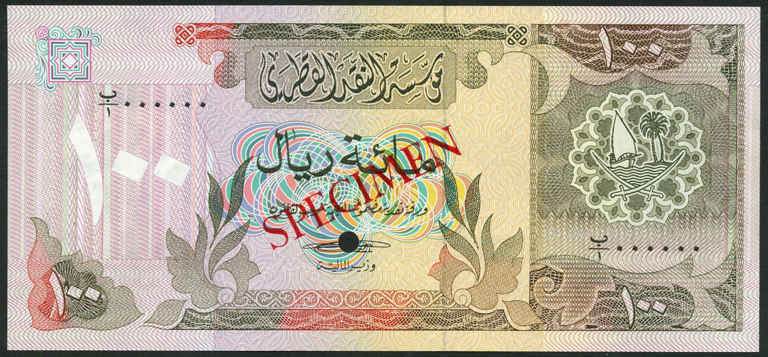 Qatar Monetary Agency, specimen 100 riyals, ND (1981), zero serial numbers, red, brown and dark green on multicolour underprint, dhow, palm and crossed swords at right, value at corners, reverse bank building at centre, one cancellation hole, red SPECIMEN overprint
