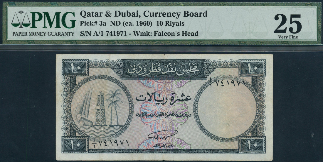 Qatar & Dubai Currency Board, 10 riyals, ND (1966), serial number A/1 741971, dark grey, coat of arms with dhow, oil derrick and palm trees at left, reverse, geometric patterns
