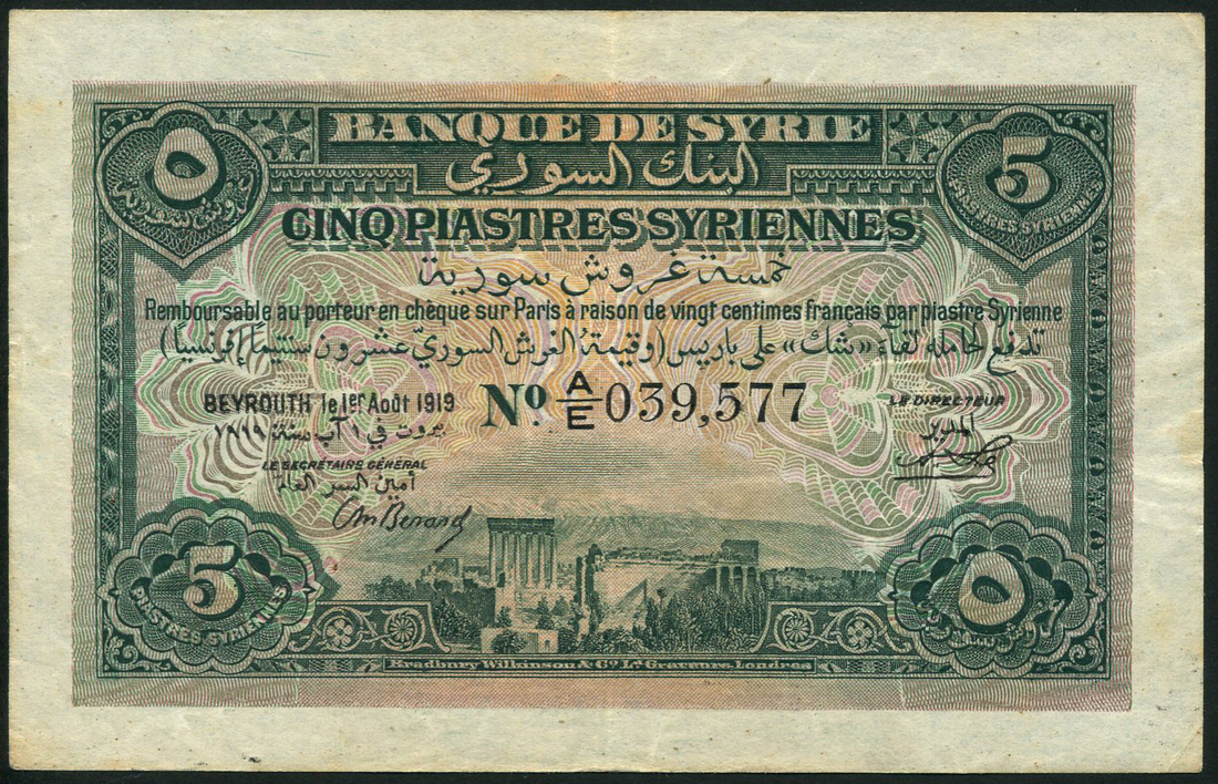 Banque de Syrie, 5 piastres (2), 1 August 1919, serial numbers A/E 039, 577 and A/AE 051,517, dark green on multicolour underprint, ruins of Baalbek at low centre, bank title across top, reverse, blue and mauve geometric pattern, lion's head at centre