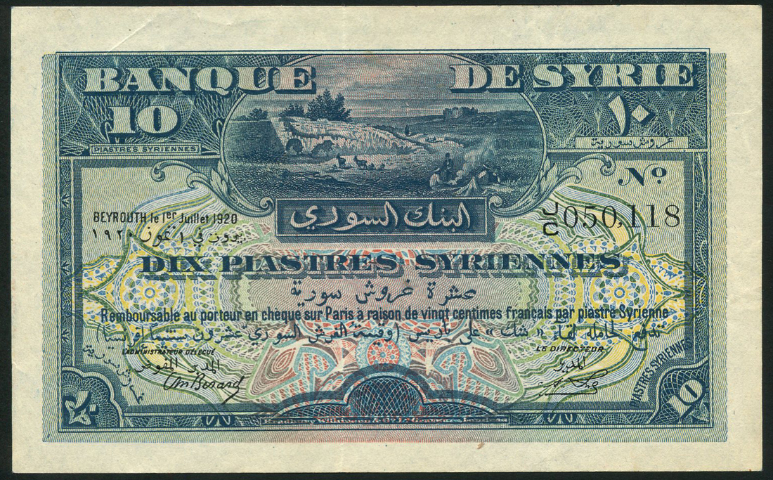 Banque de Syrie, 10 piastres, 1 July 1920, serial number J/C050,118, dark blue and multicolour, bank title along top, shepherds around campfire, goats in background at centre, reverse, pink and mauve, value in Roman and Arabic numerals