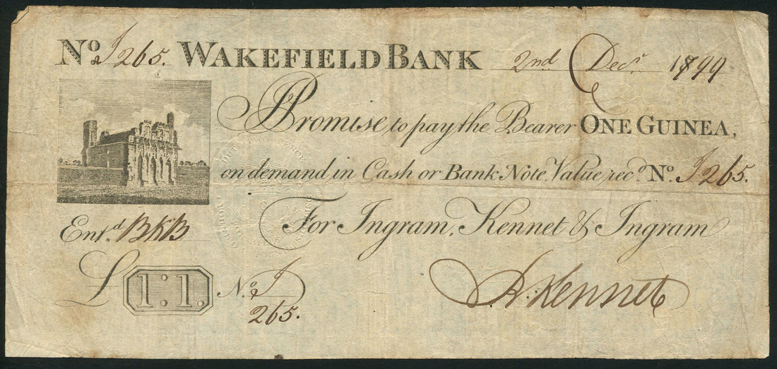 Wakefield Bank (Ingram, Kennet & Ingram), 1 guinea, 2 December 1899, serial number I265 black print, ruins top left, embossed duty stamp at centre, manuscript signature of Kennet low right,