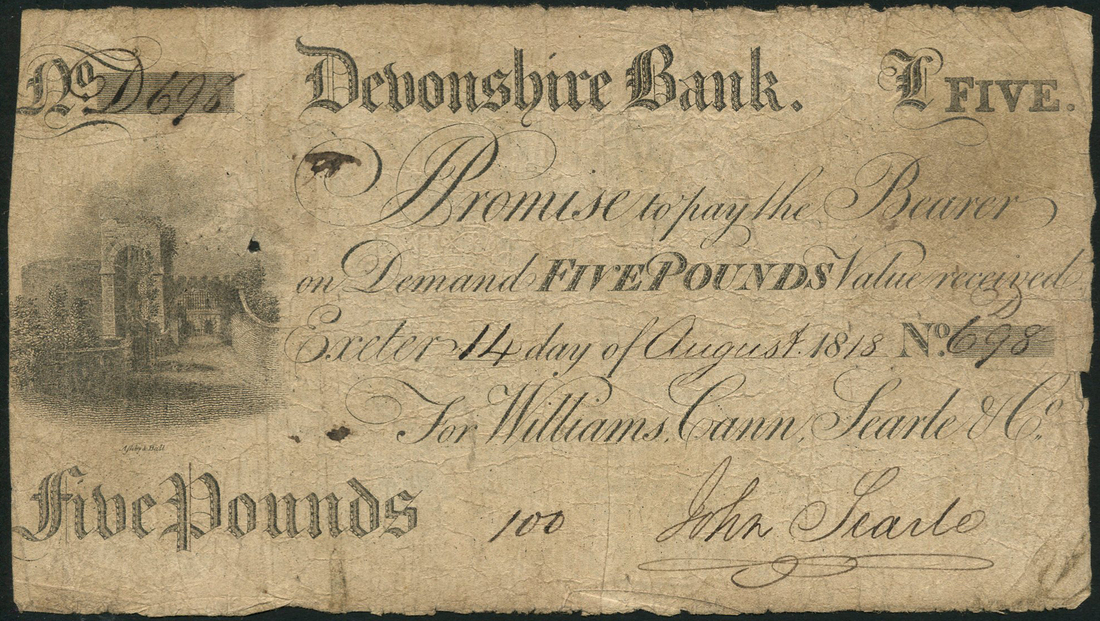 Devonshire Bank, William, Cann, Searle & Co, £5, 14 August 18(18), serial number 698, Bristol Bullion Bank (Browne, Canenagh & Bayly), £1, 182(3), serial number C6744, Yeovil Old Bank, (John Daniell, John Hutching & G.T.Gollop), 20 April 18(20), serial number B181, cut cancelled