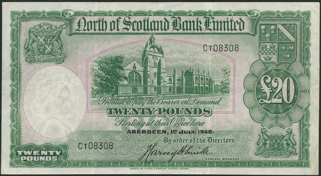 North of Scotland Bank Limited, £20 (3), 1 July 1940, serial number CT08308, 1 July 1943, serial number KT01983, 1 July 1949, serial number MT09364, green on pale pink, King's College, Aberdeen at centre, bank arms top left, two coats of arms and value in ornate tablet at right, reverse, green and pink, bank arms in guilloche pattern