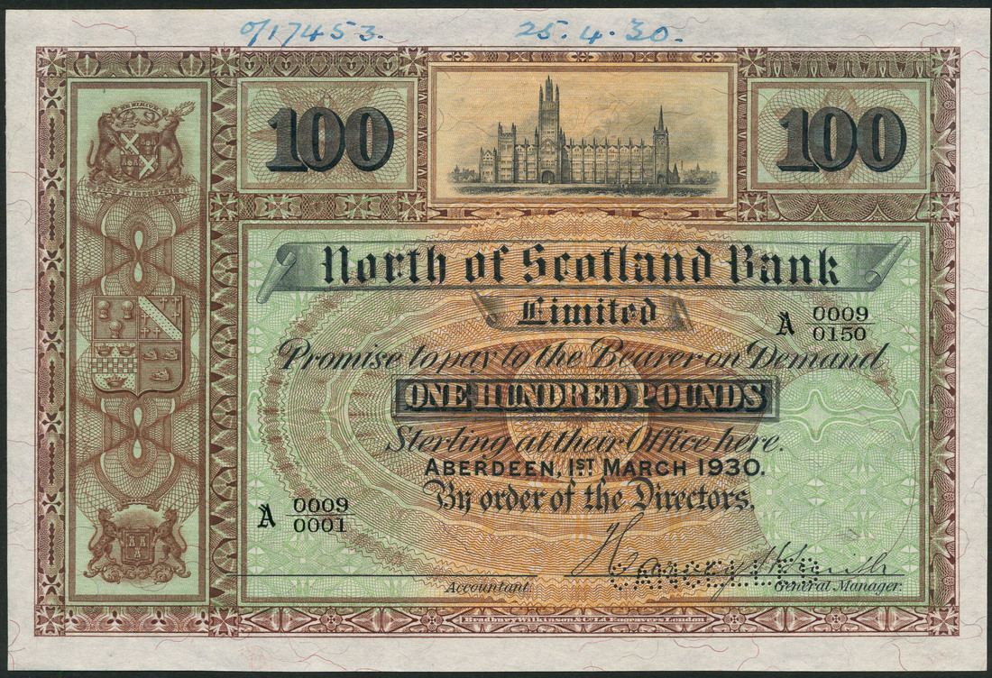 (†) North of Scotland Bank Limited, printer's archival specimen £100, Aberdeen, 1 March 1930, serial number run A 0009/0001 to A 0009/0150, printed signature of General Manager, brown and black on pale blue-green and orange underprint, Marischal College at top centre, value at left and right, coats of arms in panel at left, reverse coat of arms in ornate circle, value in five guilloches, perforated CANCELLED