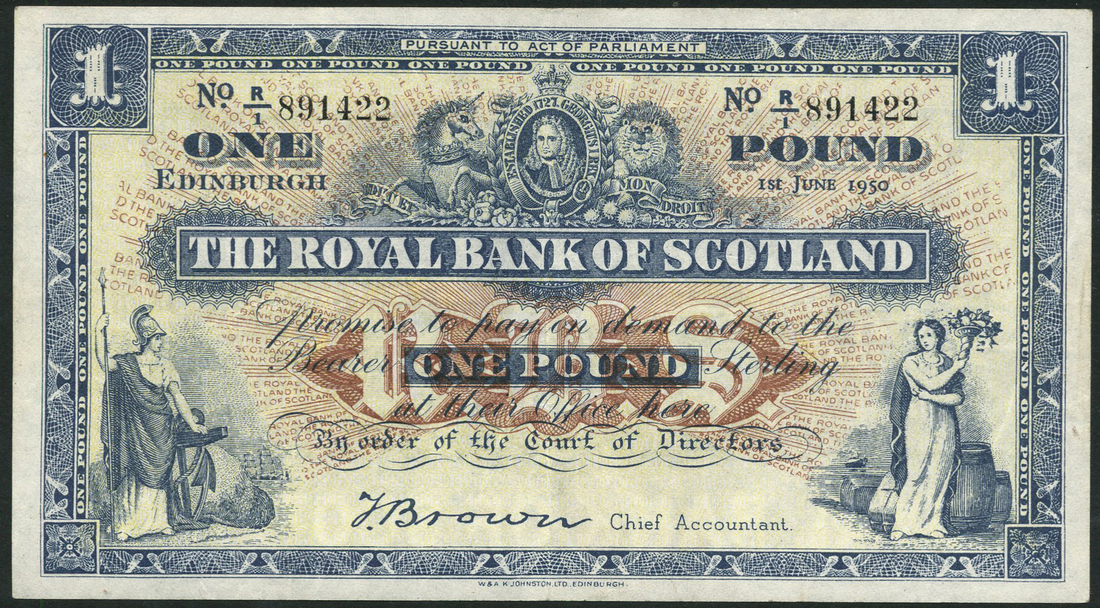 Royal Bank of Scotland, £1 (9), 1950, serial number R/1 891422, 1952, serial number V/1829070, 1953, serial number Z/1303445, 1953, serial number AA551436, 1959, serial number AW810323, 1965, serial number CE063807, 1967, serial number CV632055, 1967, serial number CW169749 and 1967, serial number A/7674119