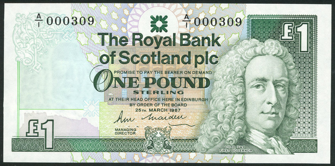 Royal Bank of Scotland plc, £1 ( ), 3 May 1982, serial number C/62 854117, 1 October 1983, serial number C/68 194636, 1 May 1986, serial number D/44 645066, 17 December 1986 (2), serial number D/68 000496 and A/1 000309, 25 March 1987 (2), serial number A/1 000999 and A/39 060369, 13 December 1988, serial number A/41 654506, 24 July 1991, serial number B/38 912002, 24 March 1982, serial number B/57 543501, 8 December 1992, serial number EC0040190, 3 December 1994, serial number RLS1993679, 23 March 1994, serial number C/31 766668, 23 March 1994, serial number C/31 733290, 1 October 1997, serial number C/68 568517, 30 March 1999, serial number C/82 539143, 3 March 1994, serial number AGB 0078984, 12 May 1999 (3), serial number SP0700080, SP 0153612/3, 27 June 2000, serial number C/83 001002