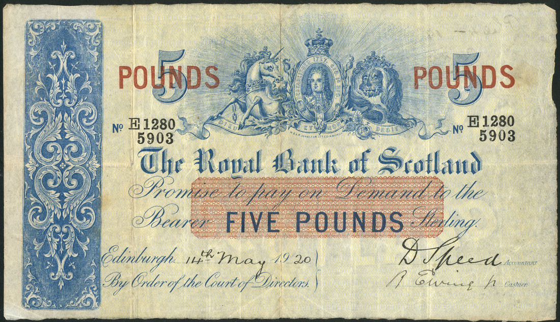 Royal Bank of Scotland, £5, 14 May 1920, serial number A1280 5903, uniface, blue on yellow background, portrait George I flanked by lion and unicorn at top centre, ornate panel at left, value in red tablet at centre with bank title above, Speed/Ewing signature
