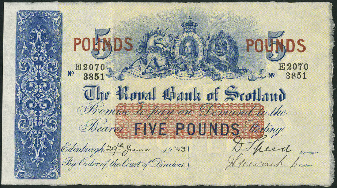 Royal Bank of Scotland, £5, 29 June 923, serial number E2070 3851, uniface, blue on yellow background, portrait George I flanked by lion and unicorn at top centre, ornate panel at left, value in red tablet at centre with bank title above, Speed/Stewart signature