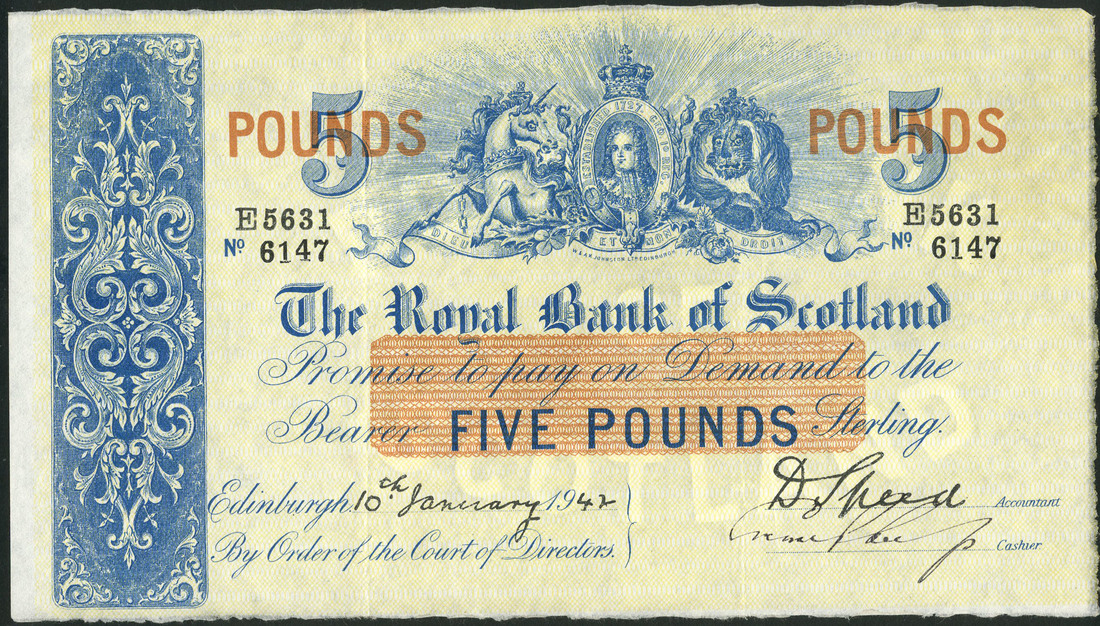 Royal Bank of Scotland, £5, 10 January 1942, serial number E5631 6147, uniface, blue on yellow background, portrait George I flanked by lion and unicorn at top centre, ornate panel at left, value in red tablet at centre with bank title above, Speed signature