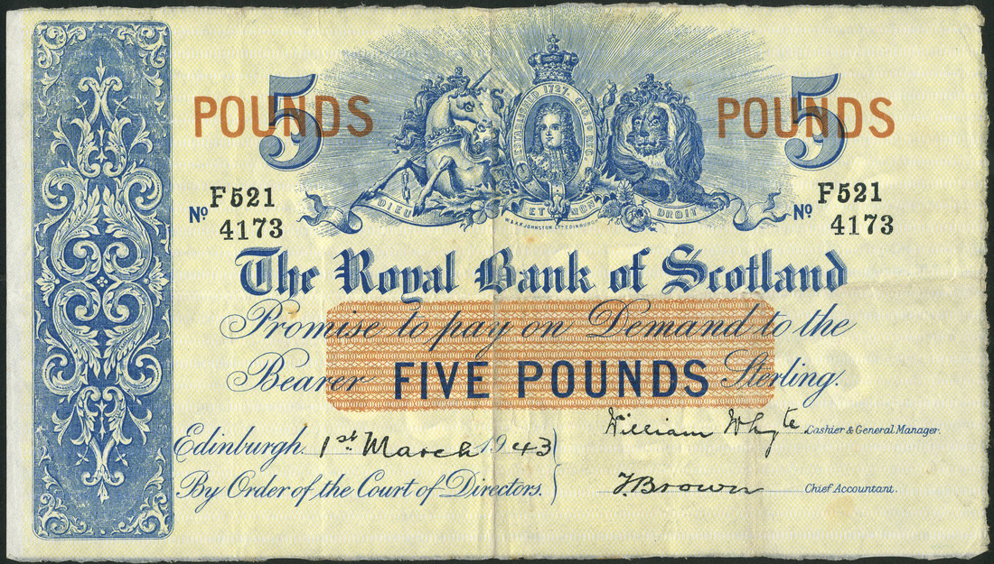 Royal Bank of Scotland, £5 (3), 1 March 1934, serial number E3504 627, 1 July 1942, serial number F83 6480, 1 March 1943, serial number F521 4173, all blue on yellow underprint, portrait George I flanked by lion and unicorn at top centre, ornate panel at left, value in reddish brown panel at centre