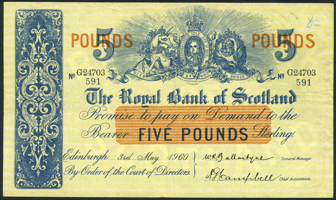 Royal Bank of Scotland, £5 (4), 3 May 1960, serial number G24703, 2 November 1964, serial number H4976 5085, 2 August 1965, serial number H8097 9264, blue on yellow underprint, portrait George I flanked by lion and unicorn at top centre, ornate panel at left, value in reddish brown panel at centre, and 1 November 1966, serial number J/2 503624, blue and multicolour, portrait David Dale at left, bank arms low right