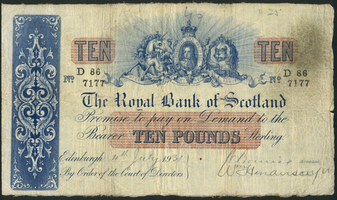 Royal Bank of Scotland, £10, 4 July 1931, serial number D66 7177, uniface, blue on yellow background, portrait George I flanked by lion and unicorn at top centre, ornate panel at left, value in red tablet at centre with bank title above, Speed signature
