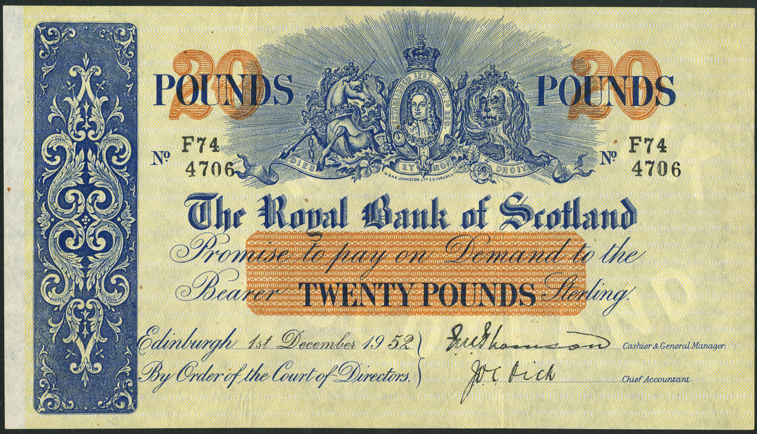 Royal Bank of Scotland, £20, 1 December 1952, serial number F74 4706, uniface, blue on yellow background, portrait George I flanked by lion and unicorn at top centre, ornate panel at left, value in red tablet at centre with bank title above, Thomson/Dick signature