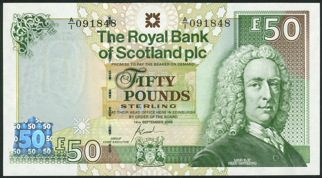 Royal Bank of Scotland plc, £50 (2), 14 September 2005 (2), serial numbers A/1 091848 and RBS 12140, green and multicolour, portrait Lord Ilay at right, bank arms low centre, illustration of head office above, value low centre left, centre and top right, reverse, bank building at Gogarburn