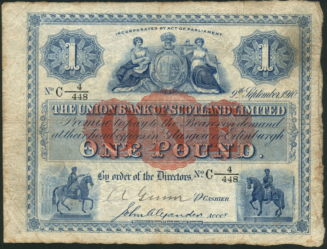 Union Bank of Scotland Limited, £1, 9 September 1910, serial number C 4/448, blue, bank coat of arms flanked by value in ornate tablets top centre, equestrian statues low left and right, red ONE at centre, Alexander signature, reverse, bank title and value in guilloche pattern