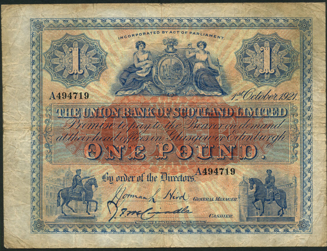 Union Bank of Scotland Limited, £1, 1 October 1921, serial number A494719, blue, bank coat of arms flanked by value in ornate tablets top centre, equestrian statues low left and right, red ONE at centre, Hird/McCrindle signatures, reverse, bank title and value in guilloche pattern