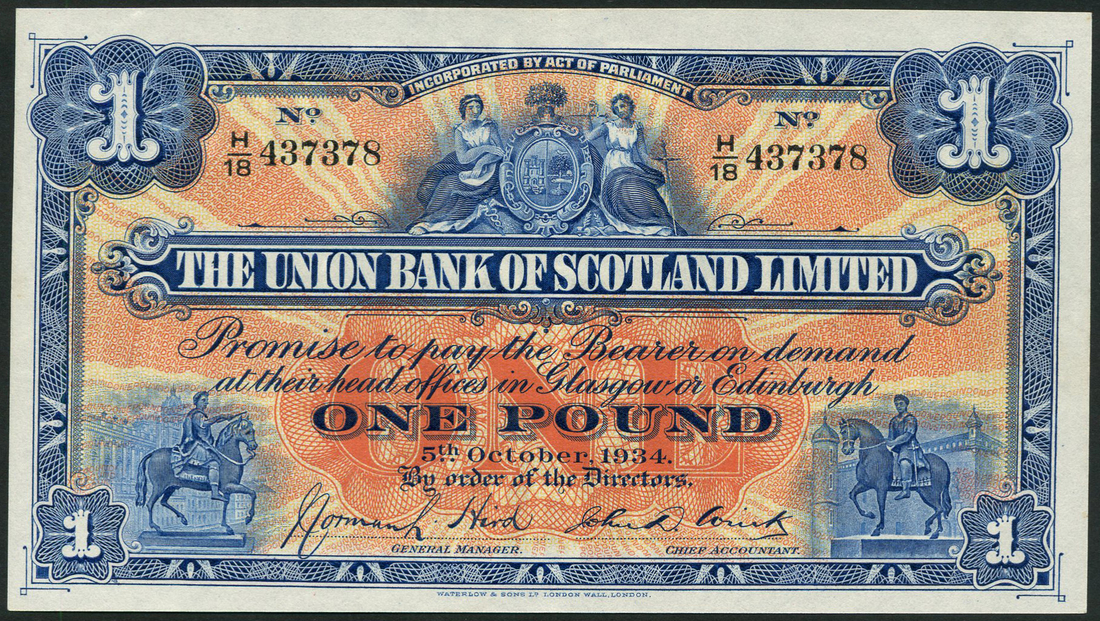 Union Bank of Scotland Limited, £1 (6), 2 June 1924 (specimen), no serial number, 3 October 1927, serial number C 530533, 2 January 1929, serial number D 935794, 5 October 1934, serial number H/18 437378, 31 May 1938, serial number M/30 728285 and 20 March 1946, serial number V/32 786435