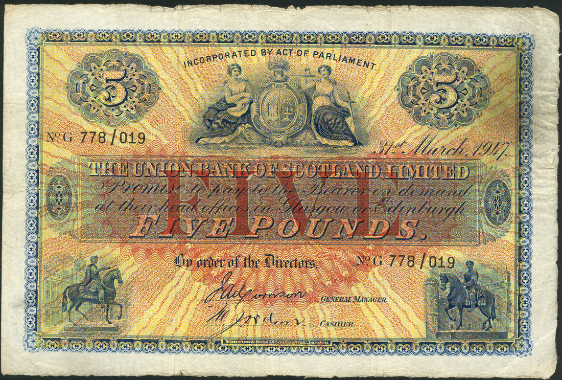 Union Bank of Scotland Limited, £5, 31 March 1947, serial number G 778/019, dark blue on red and yellow sunburst underprint, bank arms top centre flanked by value in ornate tablets, red FIVE at centre, equestrian statues low left and right, Morrison/Wilson signatures, reverse, bank title and value in blue and green guilloche pattern