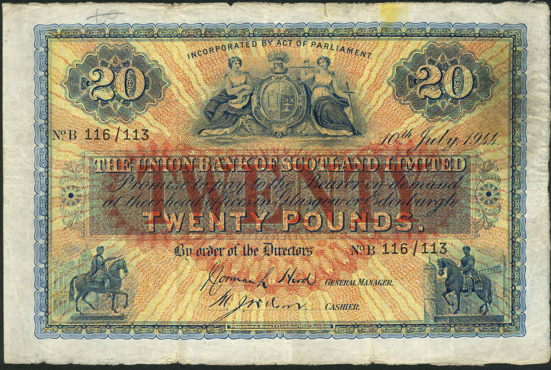 Union Bank of Scotland Limited, 10 July 1944, serial number B 116/113, dark blue on red and yellow sunburst underprint, bank arms top centre flanked by value in ornate tablets, red TWENTY at centre, equestrian statues low left and right, Hird/Wilson signatures, reverse, bank title and value in blue and green guilloche pattern