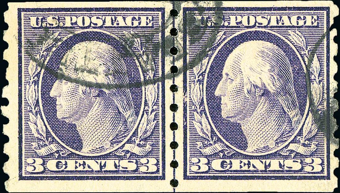#394, 3c Deep violet coil, perf. 8½ vert., used guide line pair, attractive deep color, double oval pmks., fine-very fine; an elusive line pair in used condition; 2008 PSE certificate (F-VF 75; SMQ $375.00).