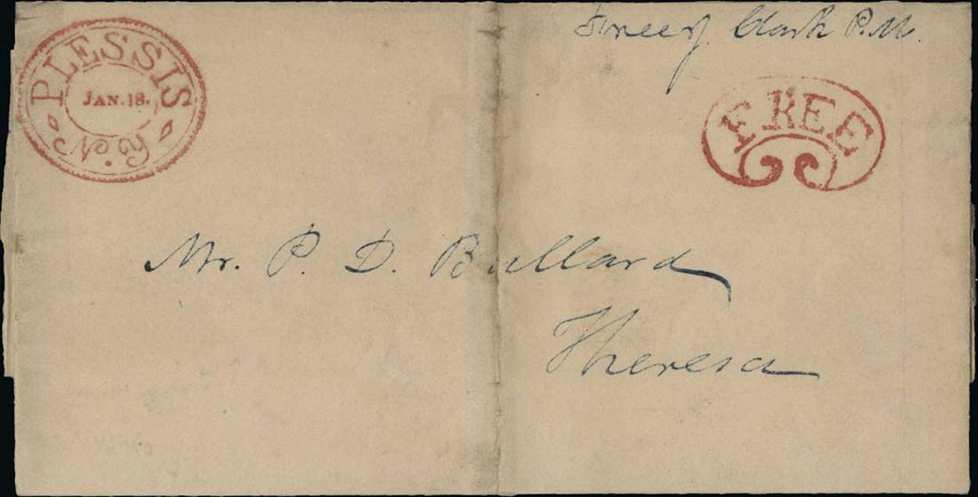 Plessis, N.Y./Jan 18 beautifully struck fancy oval postmark and matching fancy "Free" in scroll on folded cover to Theresa, reinforced file folds, extremely fine strike.