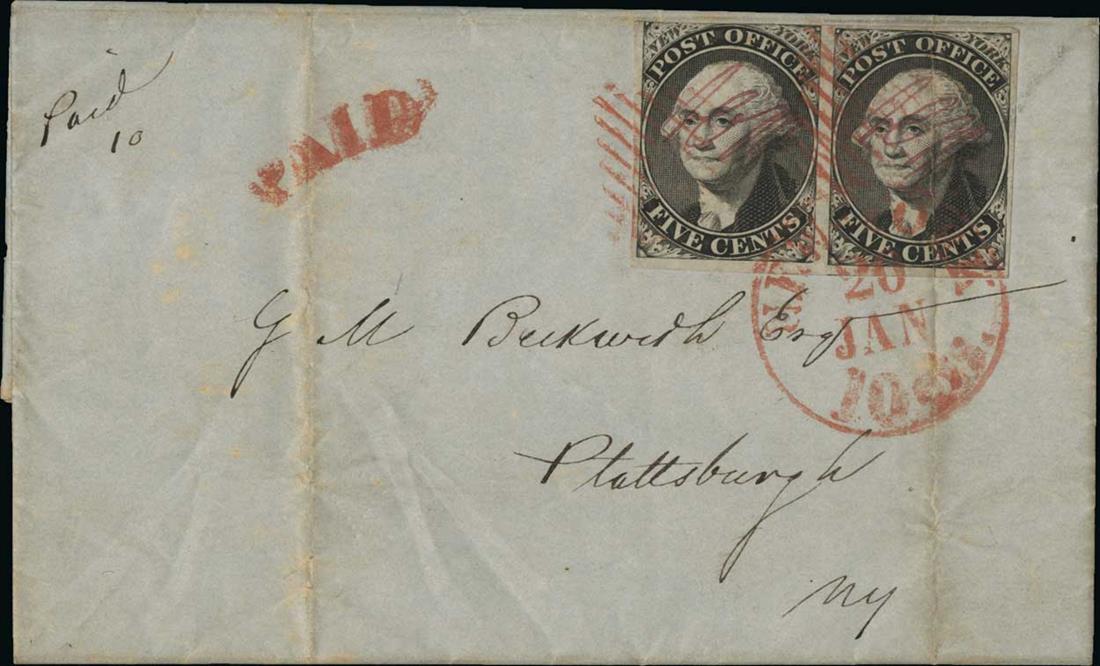 #9X1, New York, N.Y., 5c Black Postmaster Provisional, signed ACM connected, horizontal pair, clear to large margins nearly all around except just into the frame line at top left, deep rich color, tried to1847 entire folded letter to Plattsburg, N.Y. by red diamond grids and "New York/10Cents/20 Jan" c.d.s., matching "Paid" arc at left, vertical file fold affects the right stamp, very fine appearance and a scarce cover.
