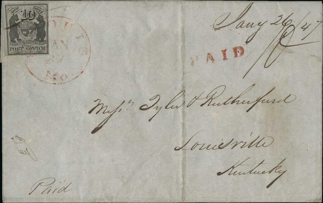The correspondence to Tyler and Rutherford of Louisville, Kentucky is one of five major correspondences of St. Louis "Bears." This Louisville correspondence was discovered in a huge find in 1895 by a Janitor burning papers, a later group from this correspondence came to market in 1902 and was purchased by C. W. Mekeel. Many of the stamps on this correspondence as well as the four other correspondences have been removed from their covers resulting in their scarcity on cover. In addition it should be noted that the banking firm of W. Nisbet and Co. in Saint Louis was a regular user of these stamps on their correspondence over the entire period of their use. The earliest recorded usage of any Saint Louis Provisional was used by that firm on November 13, 1845. This cover being on greenish paper is one of the latest usages in January 27, 1847 by this same banking house. All in all an exceptionally handsome cover of the greatest appeal and rarity.