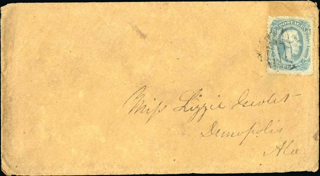 #12f, 10c Blue, officially perforated 12½, single with excellent centering, tied by grid cancel to cover to Demopolis, Alabama, very fine and scarce on cover; 2014 PF certificate.