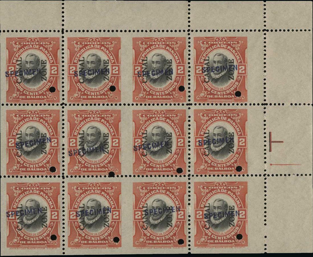 #39cS, 2c Vermilion and black, booklet pane of six, imperforate margins, overprinted "Specimen" in blue, a striking top right corner margin horizontal pair, each stamp with the usual security punch, o.g., n.h., fine-very fine and rare; as yet unlisted by Scott.