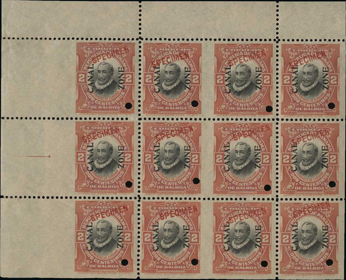 #53cS, 2c Vermilion and black, booklet pane of six, overprinted "Specimen" in red, a handsome top left corner margin horizontal pair, each stamp with the usual security punch, o.g., n.h., very fine and rare; as yet unlisted by Scott.