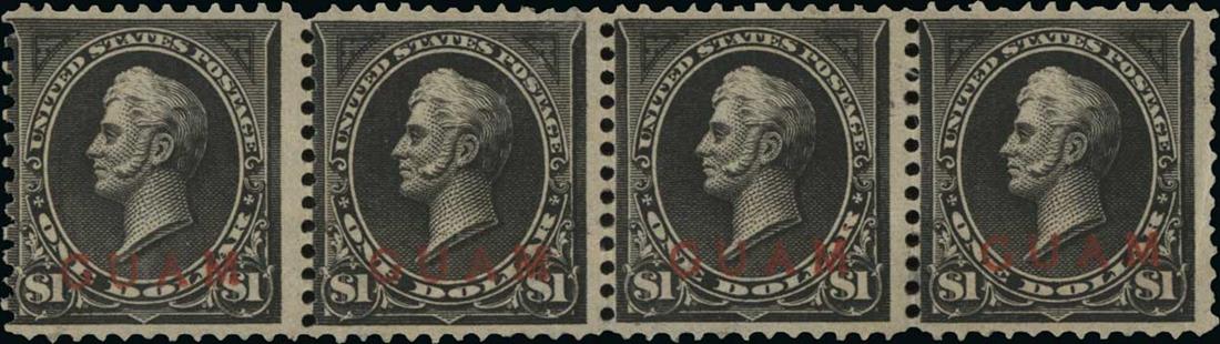 #12, $1.00 Black, seldom seen horizontal strip of four, full o.g., very lightly hinged, very good-fine.