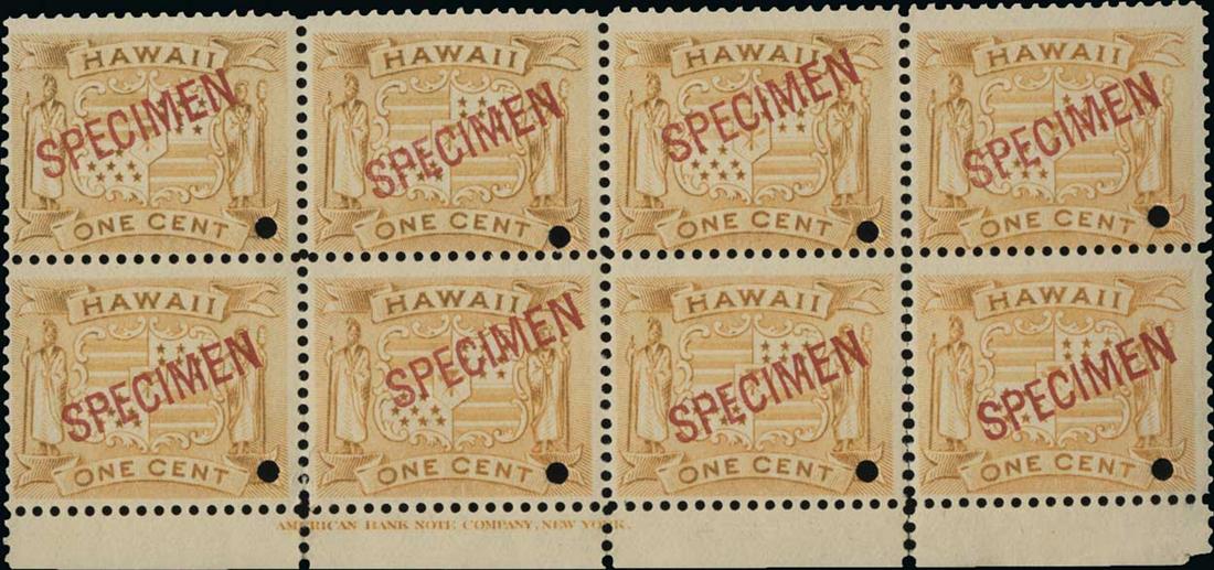#74S, 1c Yellow, with red diagonal "Specimen" overprint and security punch hole as always, bottom sheet-margin block of eight (4x2) with American Bank Note Co. imprint, o.g., n.h., fine and rare; 2008 PF certificate.