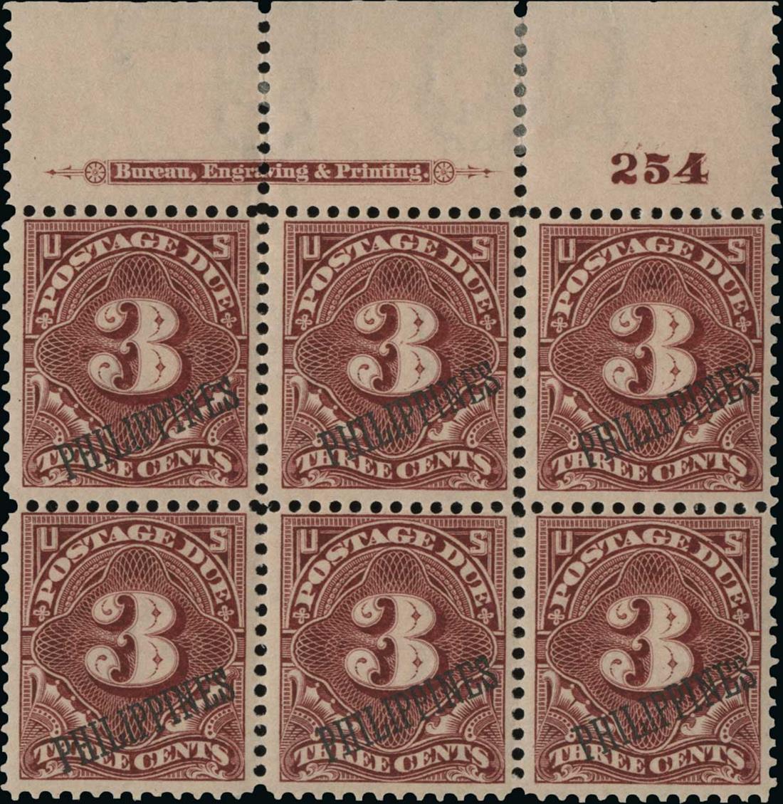 #J6, 3c Deep claret, top margin imprint and plate no. 254 block of six, deep luxuriant color and surprisingly fresh, o.g., l.h., a few reinforced perforations in the selvage, fine and rare;