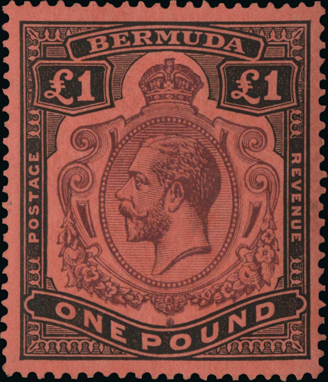 S.G. #55g, 1918 £1 Purple and black on red, gash in fruit and leaf, fresh and well centered, vivid rich colors, o.g., lightly hinged, extremely fine and rare.