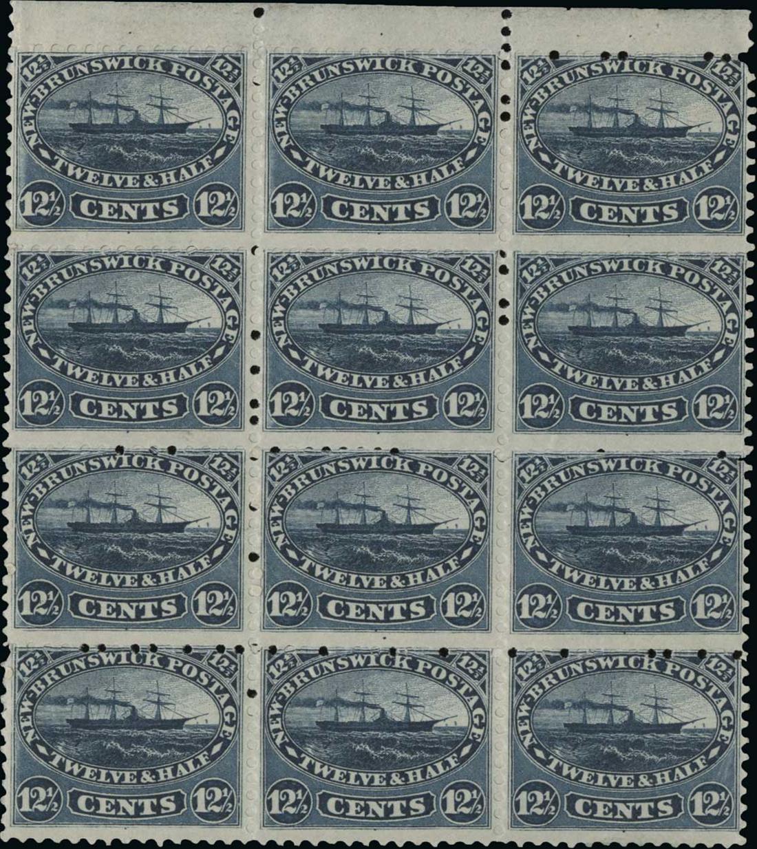 #10, 1860 12½c Blue, top sheet-margin mint block of twelve (3x4), centered to top, o.g., six stamps n.h. and the other six l.h., very good.