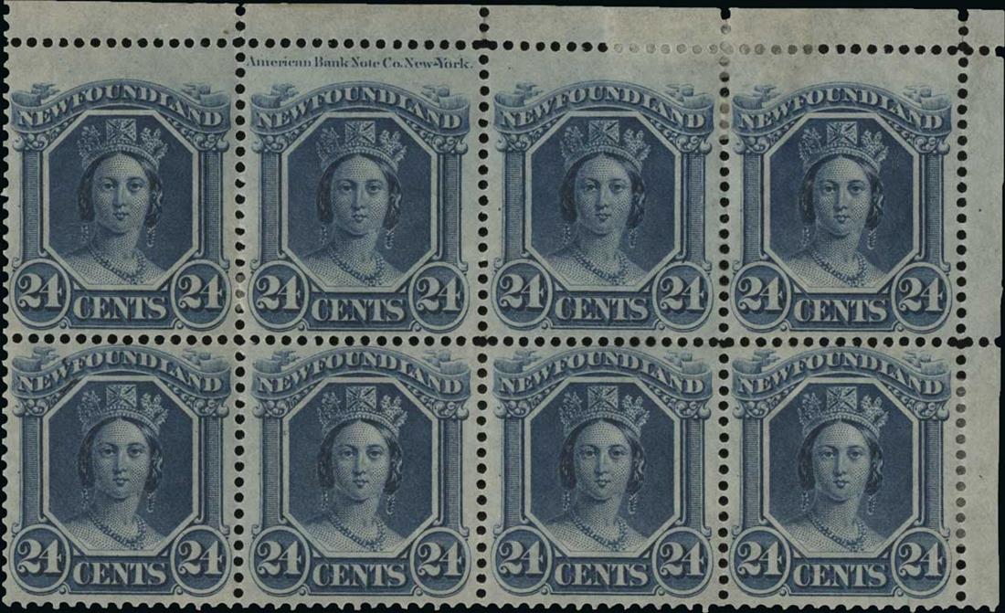 #31, 1865 12c Blue on thin translucent paper, handsome top right corner sheet-margin "American Bank Note Co. New-York" imprint block of eight, the imprint captured in the top margin of pos. 8, plus pos. 9 shows a major re-entry (Unitrade #31i), remarkably fresh, nicely centered, o.g., h.r., the bottom left pair n.h., fine-very fine; 2008 Greene Foundation certificate;
