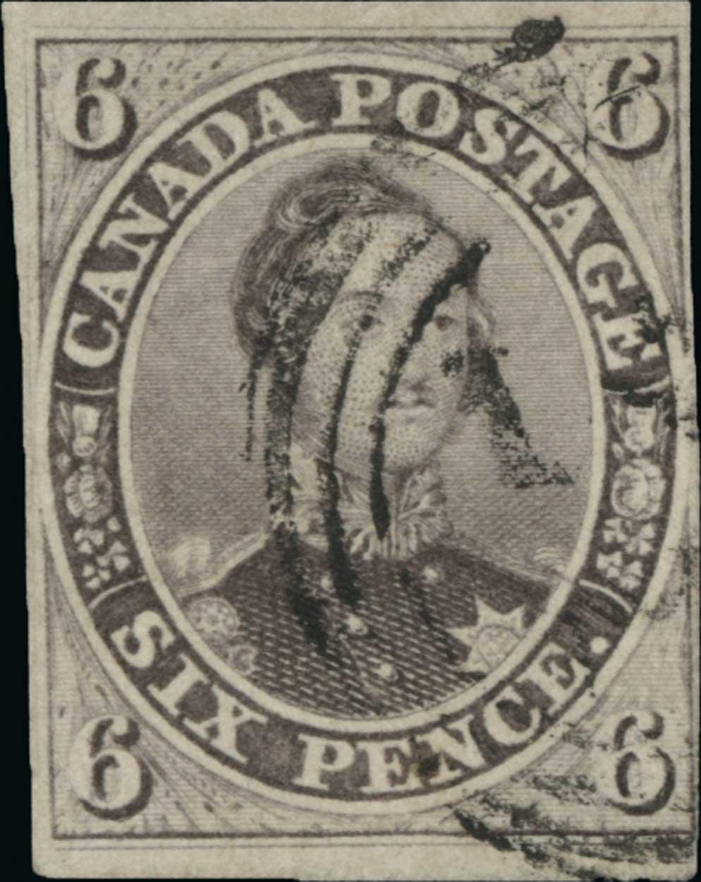 #10, 1857 6d Reddish purple on very thick soft wove paper, a fresh and attractive used example of this rare stamp, which is frequently faulty or repaired and often faked, with large margins to to touching outer frame line at right, vivid rich color and sharp impression on clean paper, neatly struck four ring "21" cancel, fine; 2006 SPES certificate (Unitrade C$4,000.00).