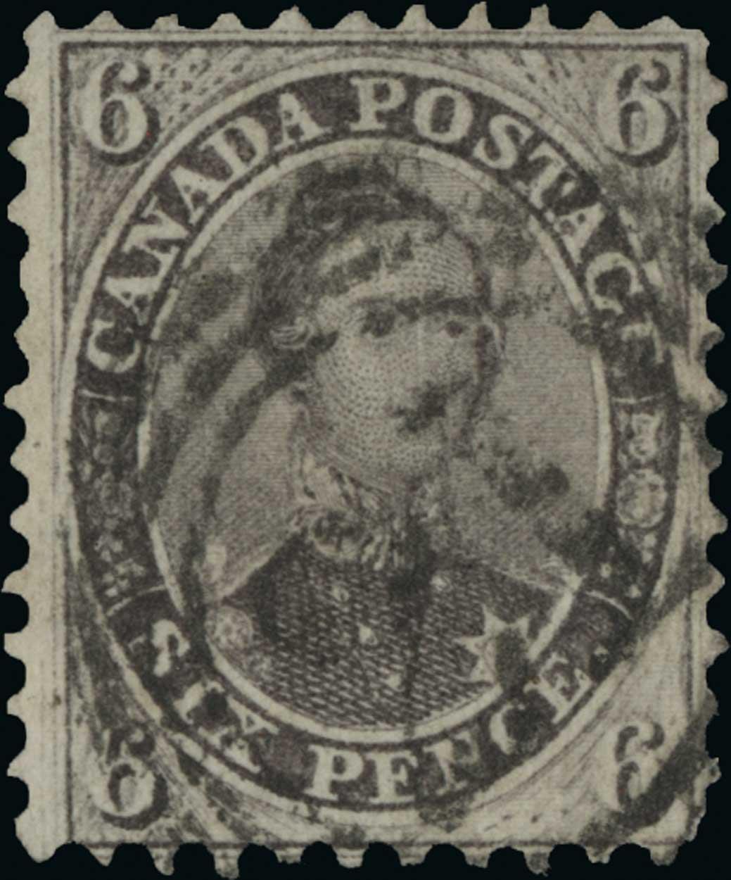 #13, 1859 6d Brown violet perforated, used with four-ring "21" cancel, perforations touch the design as nearly always, deep rich color on fresh paper, corner perf. crease at top left and rounded corner at lower right, very good appearance; 2006 CPES certificate (Unitrade C$2,500.00).