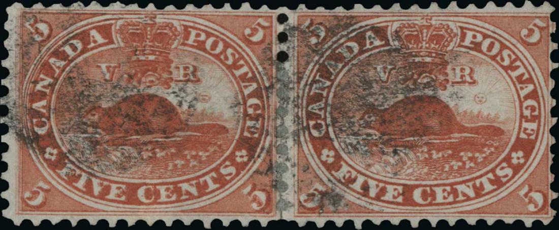 Unitrade #15v, 1859 5c Vermilion, major re-entry from pos. 28, the left stamp in a horizontal pair, rich color and strong impression show the re-entry well, cork cancels, some perf. separations rejoined with a hinged, a fine example of one of the strongest re-entries found on Canadian stamps.