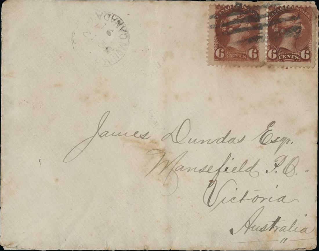 #43, 1888 6c Red brown, horizontal pair tied by grid cancel to cover to Victoria, Australia," light "Montreal/Canada/De 12, 91" datestamp alongside, Windsor, San Francisco, Melbourne and Victoria backstamps, some staining affecting the stamps, otherwise a fine and rare 12c pre-UPU rate cover; Australia joined the UPU in October, 1891, but the 5c rate was not announced to the Canadian public until January, 1892, covers used during this two month period are seldom seen.