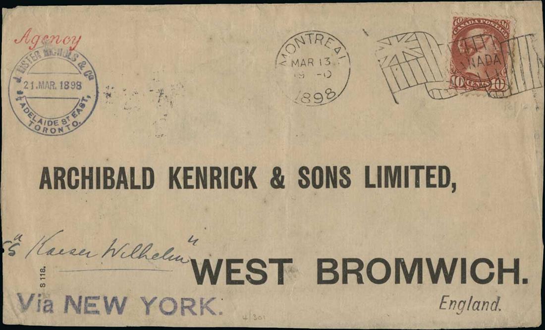 #45, 1897 10c Brown red, Morris's Deep brick brown shade, well centered and tied by "Montreal/Mar 13, 1898" waving flag machine cancel to double rate reply cover to England, endorsed "SS Kaiser Wilhelm," West Bromwich arrival backstamp, cover opened for display, stamp with some lightly toned perfs., otherwise very fine.