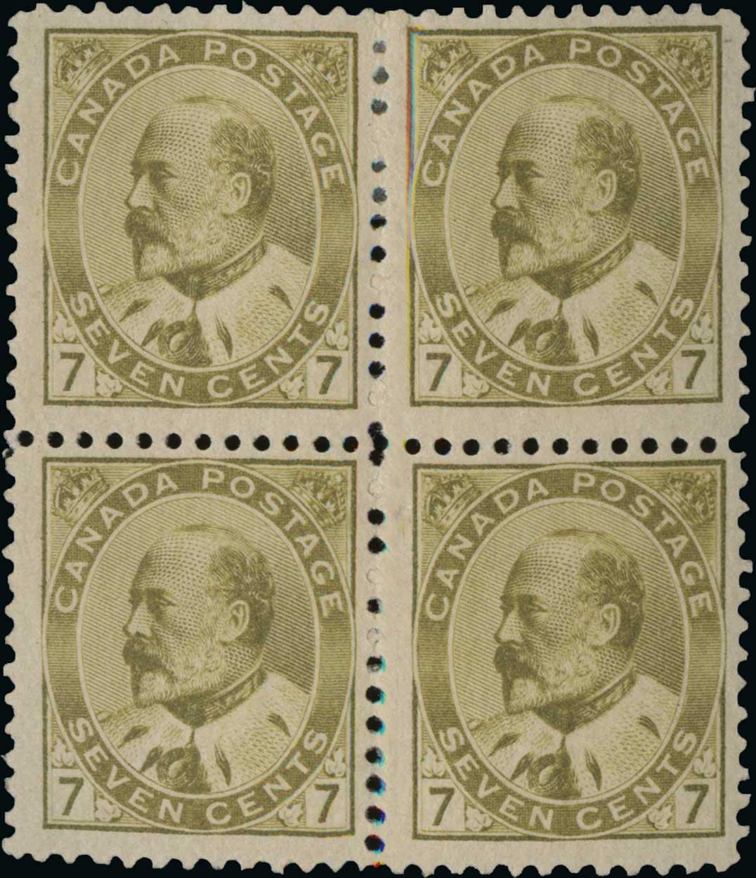 Unitrade #92ii, 1903 7c Yellow olive, mint block of four, rich color, o.g., h.r. at top, bottom pair l.h., fine-very fine.