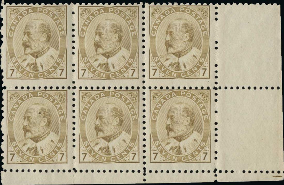 Unitrade #92iii, 1903 7c Straw, bottom right corner margin block of six (3x2), post office fresh, o.g., n.h., bottom stamps with natural gum skips at base, fine.