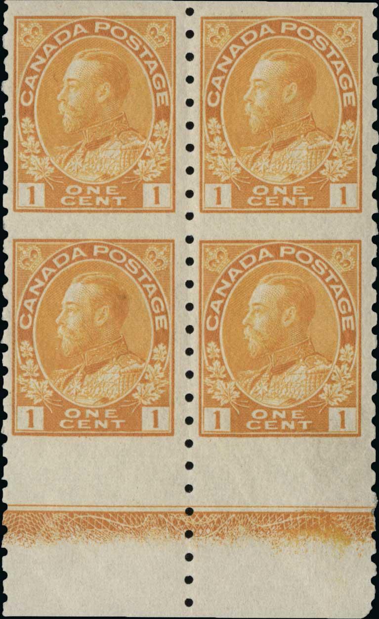 Unitrade #126c LW B, 1923 1c Orange yellow, perf. 8 vertical coil, die I, wet printing, lathework Ty. B, bottom sheet-margin mint block of four showing 60% lathework, o.g., right pair l.h. and the left pair n.h., fine-very fine and rare;