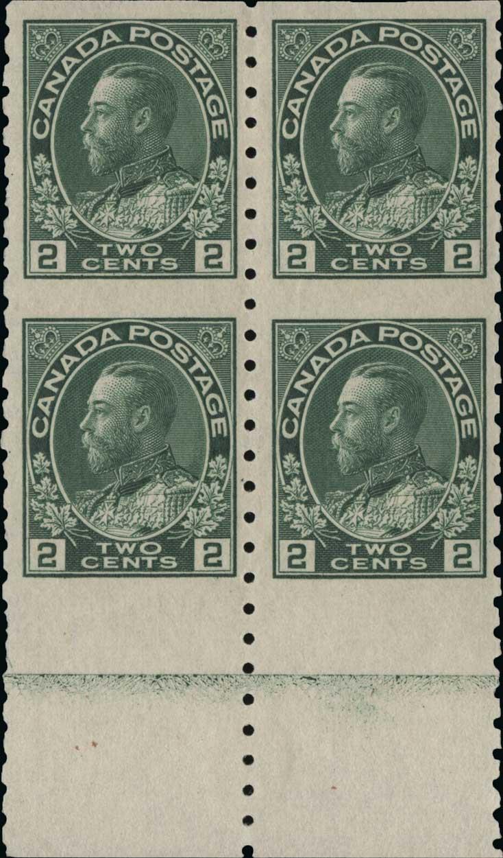 Unitrade #128ai LW D, 1922 2c Green, perf. 8 vertical coil, wet printing, lathework Ty. D, bottom sheet-margin mint block of four showing 20% lathework impression, which is the only way it comes, well centered, o.g., l.h., very fine and rare; 1989 Greene Foundation certificate.