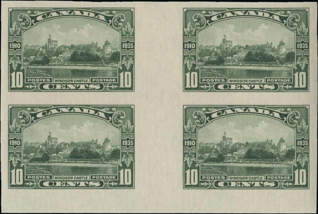 Unitrade #213i, 215i, 1935 3c and 10c Silver Jubilee, imperforate, handsome bottom sheet-margin vertical gutter blocks of four, with large even margins all around, o.g., n.h., extremely fine and rare; only the 3c and 10c values exist in this format and only ten such gutter blocks of each were produced; the catalog value is for the gutter blocks of eight.